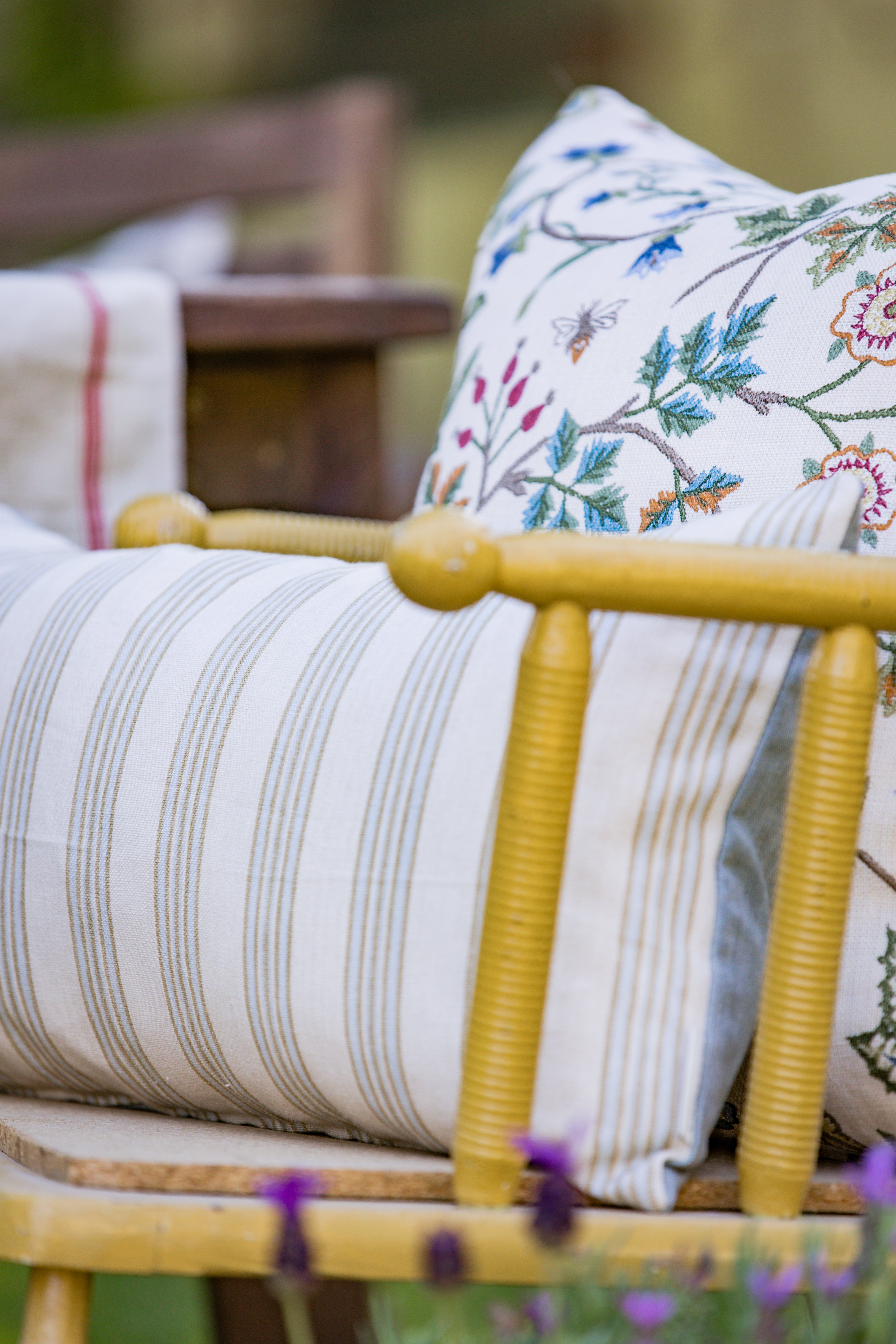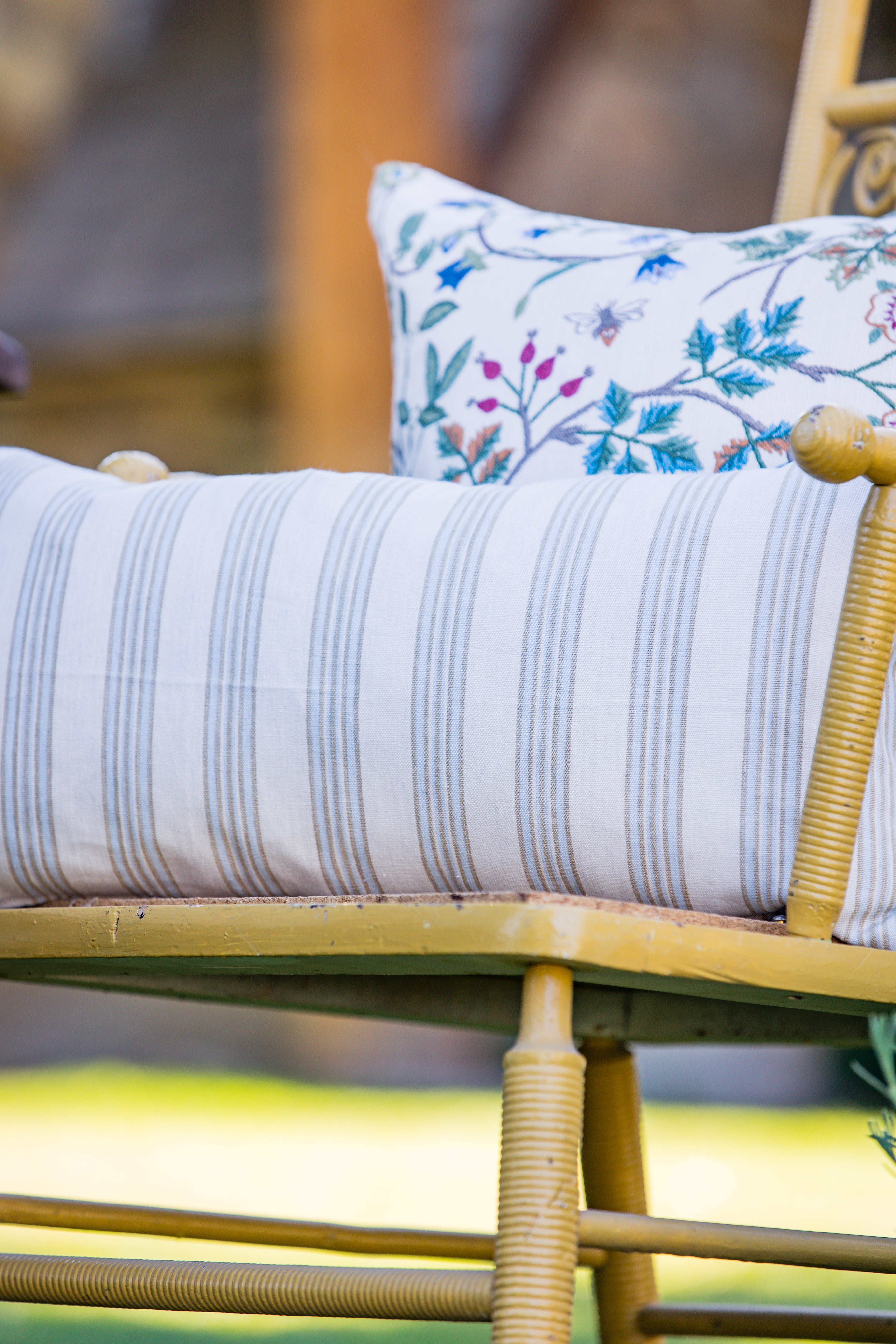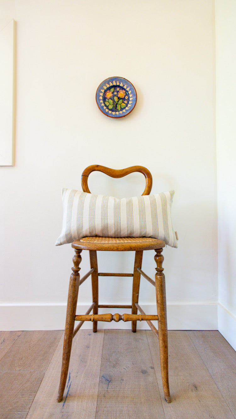 Calming stripe lumbar pillow cover. Backed in a soft blue linen.