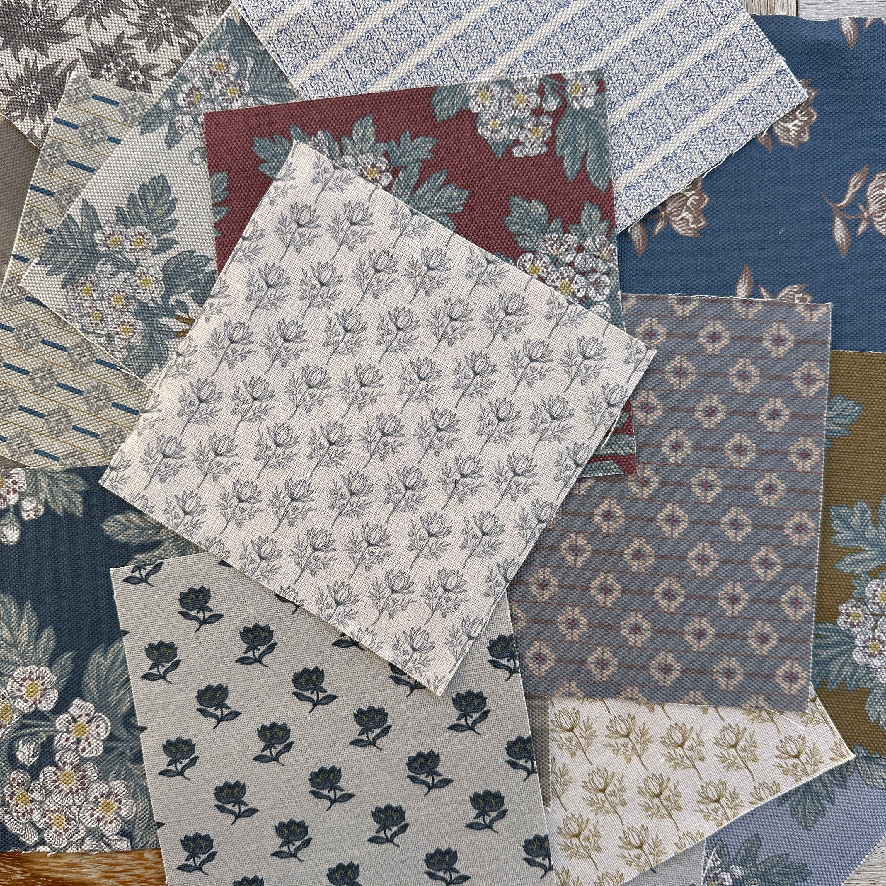 Hawthorne in Deep Navy, Hawthorne in Cumin, Hawthorne in Cranberry, Hawthorne in Cream, Hawthorne in Soft Blue, Holland in Downing, Holland in Amber, Lenten Rose Midnight, Lenten Rose Mustard, Lenten Rose Lrg on Prussian Blue, Swedish Weave Mini in Blue & Brown, Swedish Weave Mini in Wheat & Blue, Swedish Weave Large Blue, Wild Gardenia, Plaid in Latte, Mini Plaid in Latte, Paint Drop Stripe, Regal Bloom, Pineapple Flower.